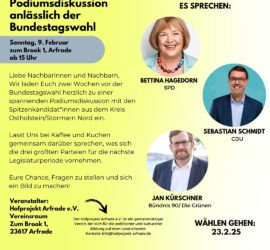 Podiumsdiskussion zur Bundestagswahl Sonntag, den 09. Februar 2025 um 15.00 Uhr Der Verein Hofprojekt Arfrade konnte anlässlich der Bundestagswahl namenhafte Politiker*innen aus Ostholstein gewinnen, die mit den Bürger*innen über die anstehende Wahl diskutieren. Dabei ist es das Ziel aufzuklären, Austausch zu ermöglichen und demokratische Angebote zu stärken. Der Verein Hofprojekt Arfrade versteht sich als Plattform, […]
