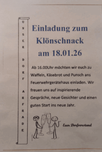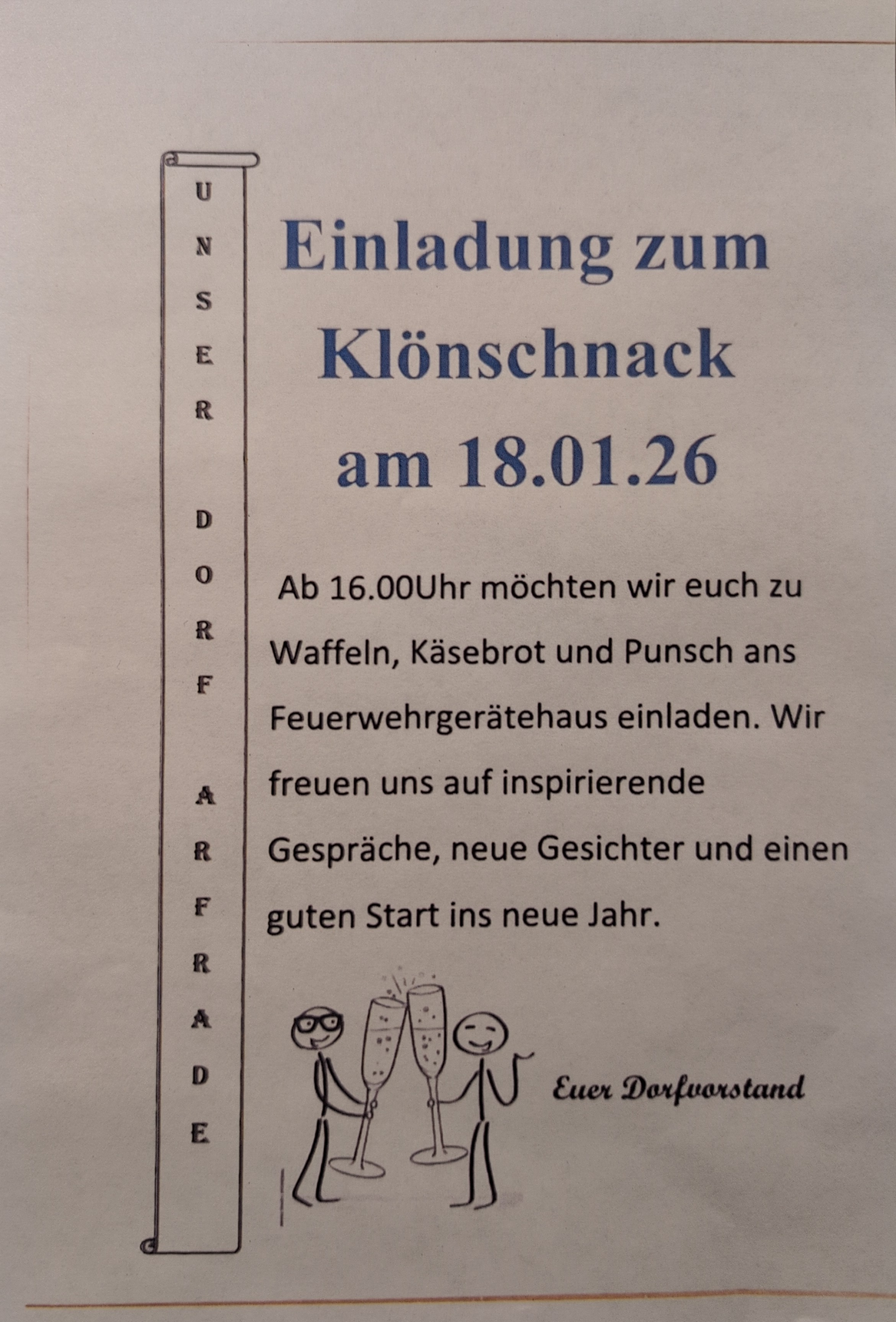 Um das neue Jahr einzuläuten möchten wir zu einem gemütlichen „Klönschnack“ mit Punsch, Käsebrot und Waffeln einladen.