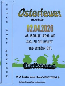 In diesem Jahr findet das Osterfeuer wieder auf der Wiese im Wischhof statt. (Zugang bei Hausnummer 8 – letztes Haus auf der rechten Seite)