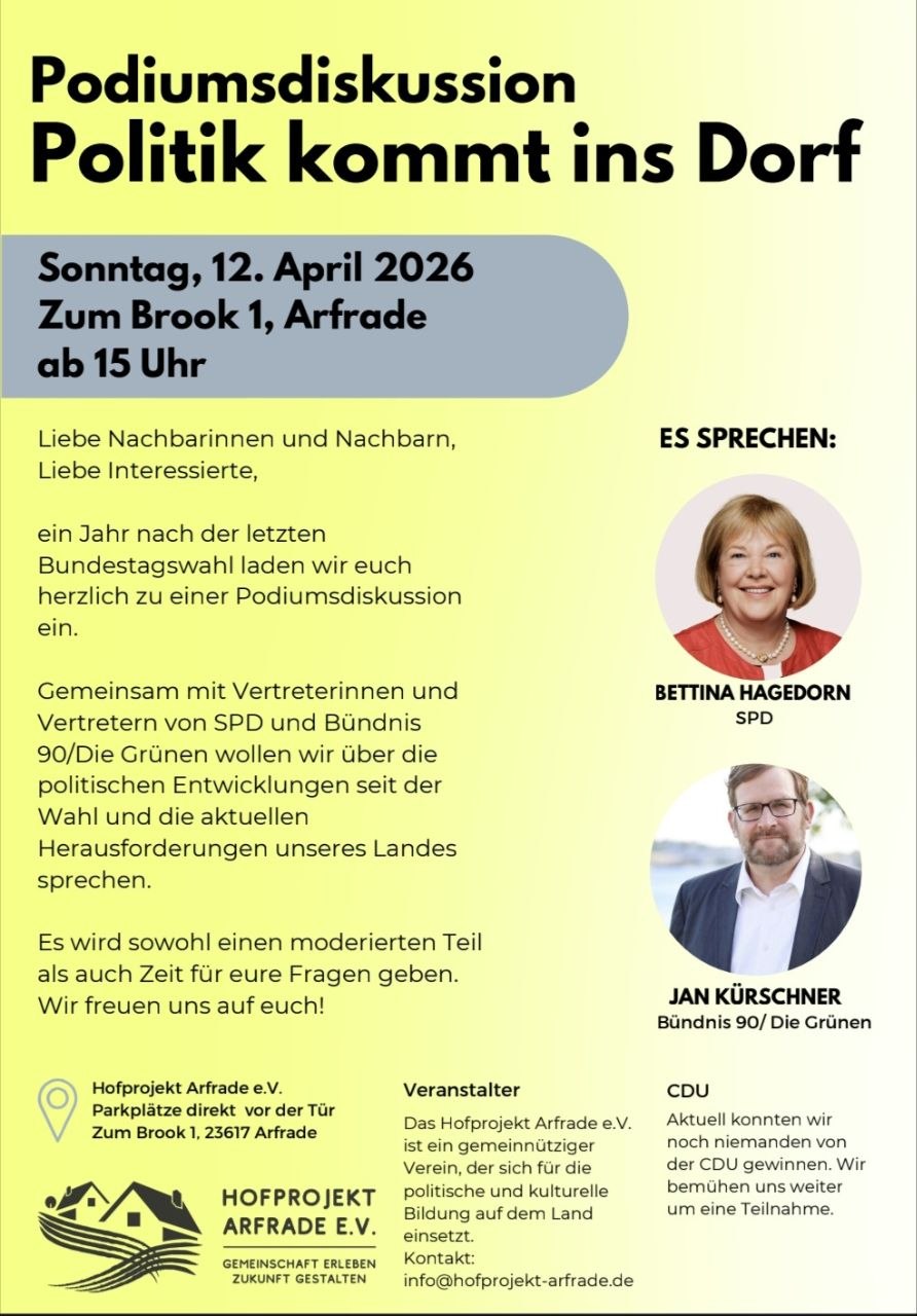 Ein Jahr nach der Bundestagswahl lädt der Verein Hofprojekt Arfrade zu einer Podiumsdiskussion ein.