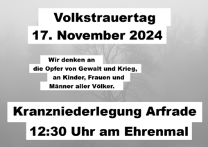 Wir versammeln uns am Sonntag, den 17. November 2024 um 12.30 Uhr am Ehrenmal in Arfrade.