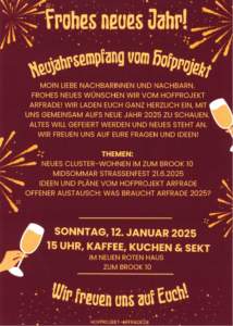 Am Sonntag, den 12. Januar 2025 um 15.00 Uhr veranstaltet der Verein Hofprojekt Arfrade einen Neujahrsempfang.